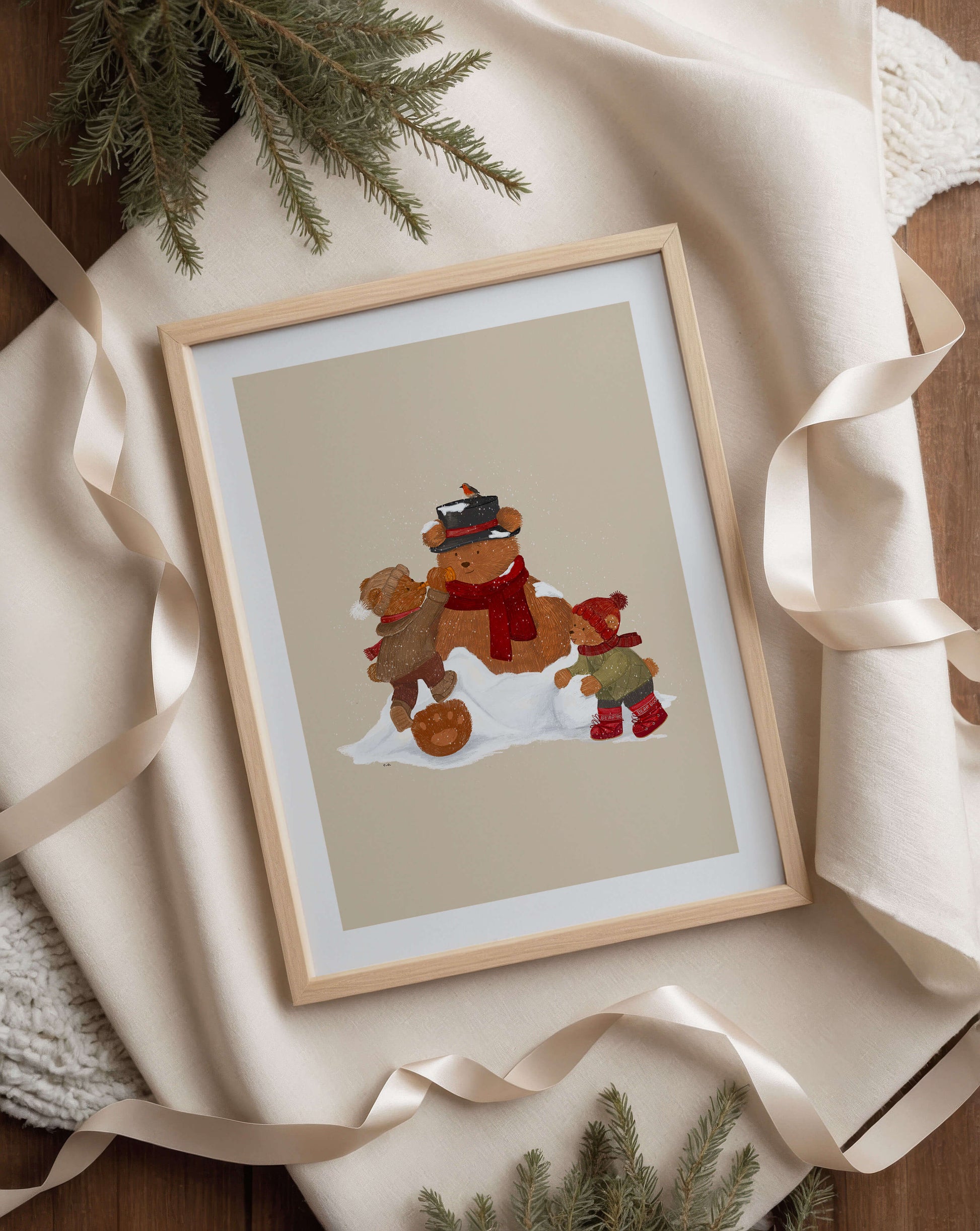 Breng de winter tot leven met deze kerstposter van Blueberry Baby, waarop twee kleine beertjes samen van papa een grote sneeuwpop maken. Met hun sjaaltjes, rode wangetjes en de vrolijke blik van papa Beer is dit een liefdevolle illustratie vol warmte en herkenning — een moment van samen zijn dat meteen aan de feestdagen doet denken.