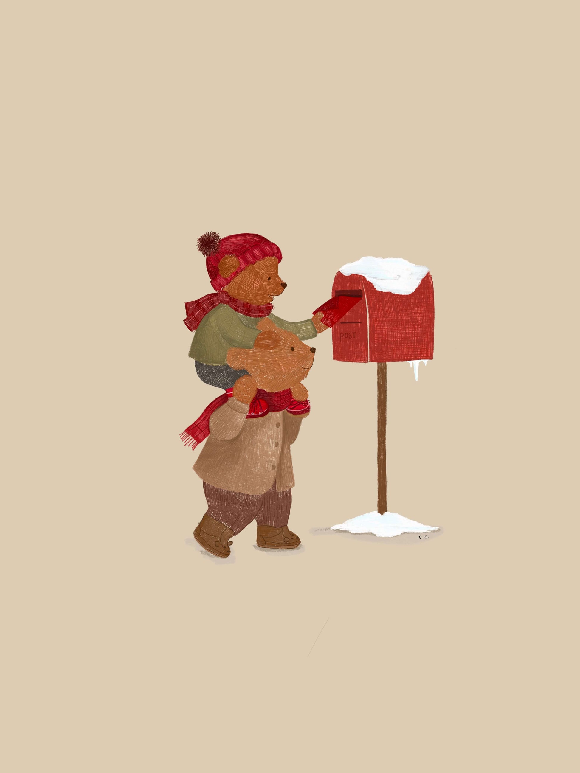 Twee kleine beertjes posten samen hun kerstkaart — dik ingepakt in mutsen, sjaals en hun mooiste winterlaarsjes trotseren ze de sneeuw. Een lieve, handgetekende illustratie die de nostalgie van december perfect vangt. Prachtig voor in de kinderkamer of als warm kerstcadeautje voor iemand die houdt van kleine tradities en de magie van vroeger.