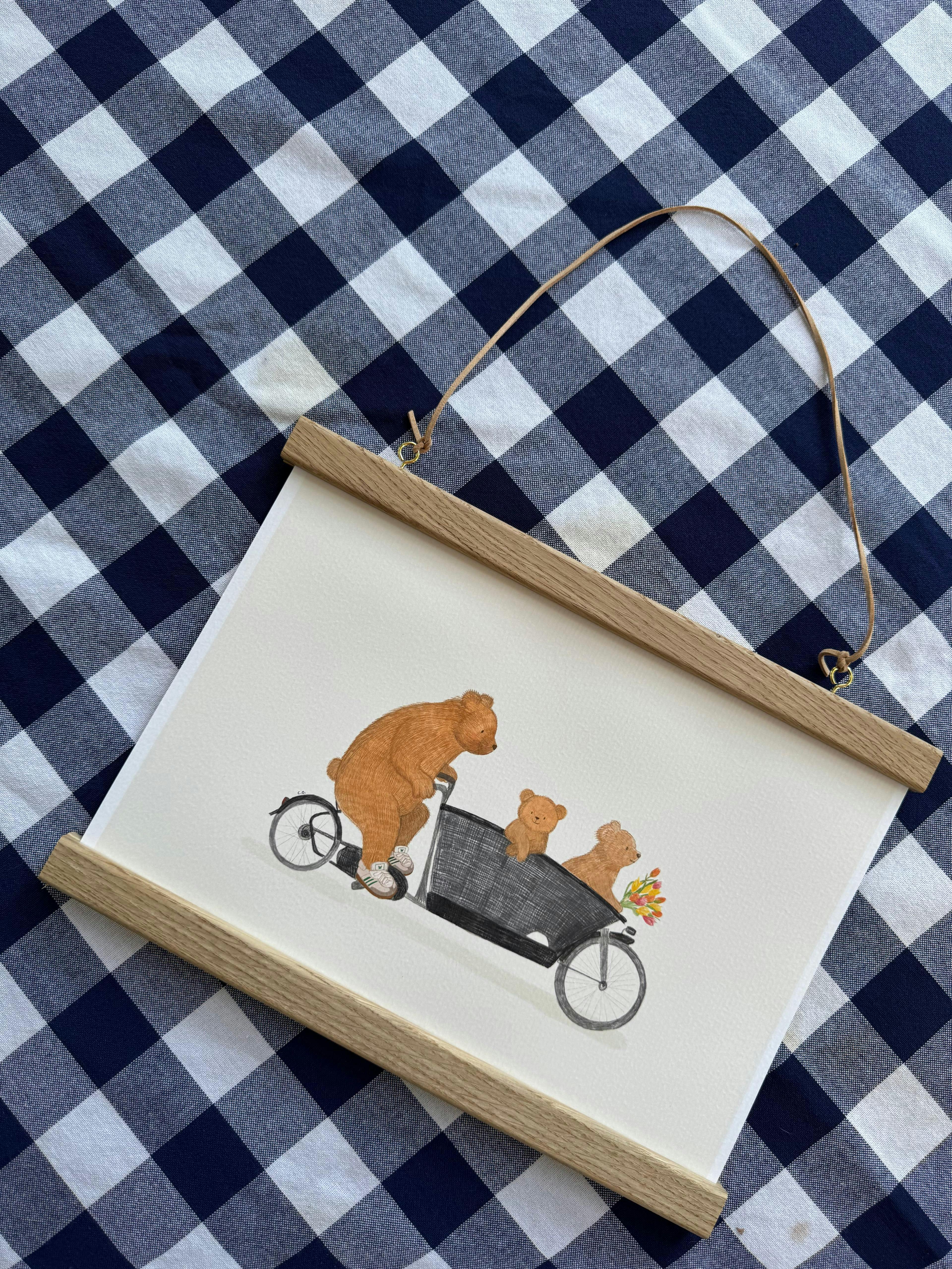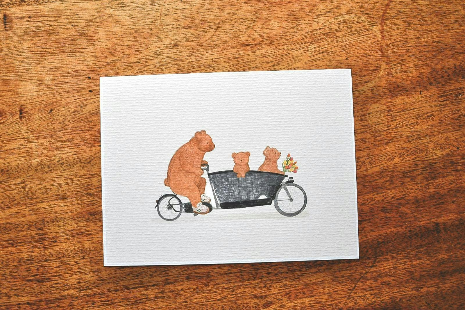 Voor de ouders die door de stad sjezen met twee kleine avonturiers in de bakfiets. Deze lieve potloodstijl tekening legt dat chaotische én knusse ritje perfect vast.